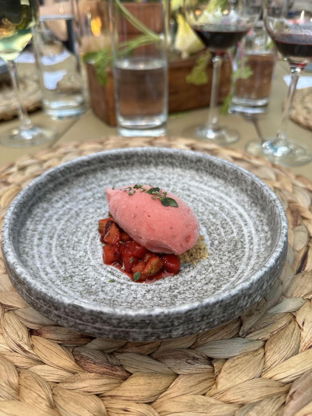 The perfectly poached halibut came in a beurre blanc sauce that was likewise seasoned by the salinity of smoked trout roe and BC sturgeon caviar. Another local protein featured was the Wagyu striploin from Abbotsford. The Corinthian black currant jus played well off the dual wine pairings for this course: French Door’s 2020 Heritage and the non-vintage Solera. A juicy strawberry sorbet cleansed the palette before a Flambé Honey-Rum Baba with lavender chantilly and a delectable macerated cherry salsa. From start to finish, the menu celebrates the garden.