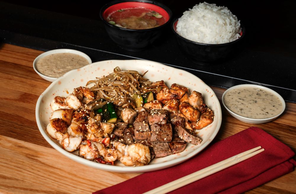 You choose your own adventure at Kobe when it comes to mains. There’s Filet Mignon, Teriyaki Chicken, Teppan Shrimp, or Miyazaki Wagyu. You can also mix and match. For example, The Ultimate comes with New York steak, Teriyaki Chicken, as well as brandy and sake sautéed Lobster Tail and broiled Atlantic Scallops.