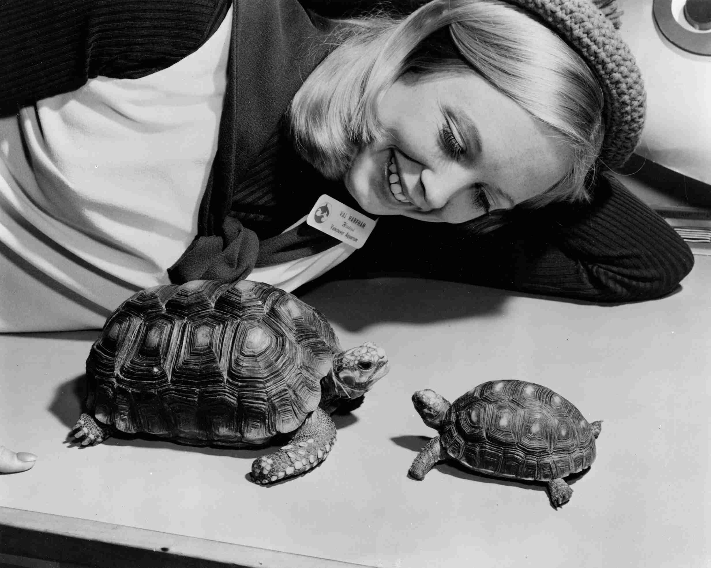 1974 – Vancouver Aquarium hostess Val Harpham gets a close look at two South American Forest Tortoises acquired by the Aquarium from Guyana.
