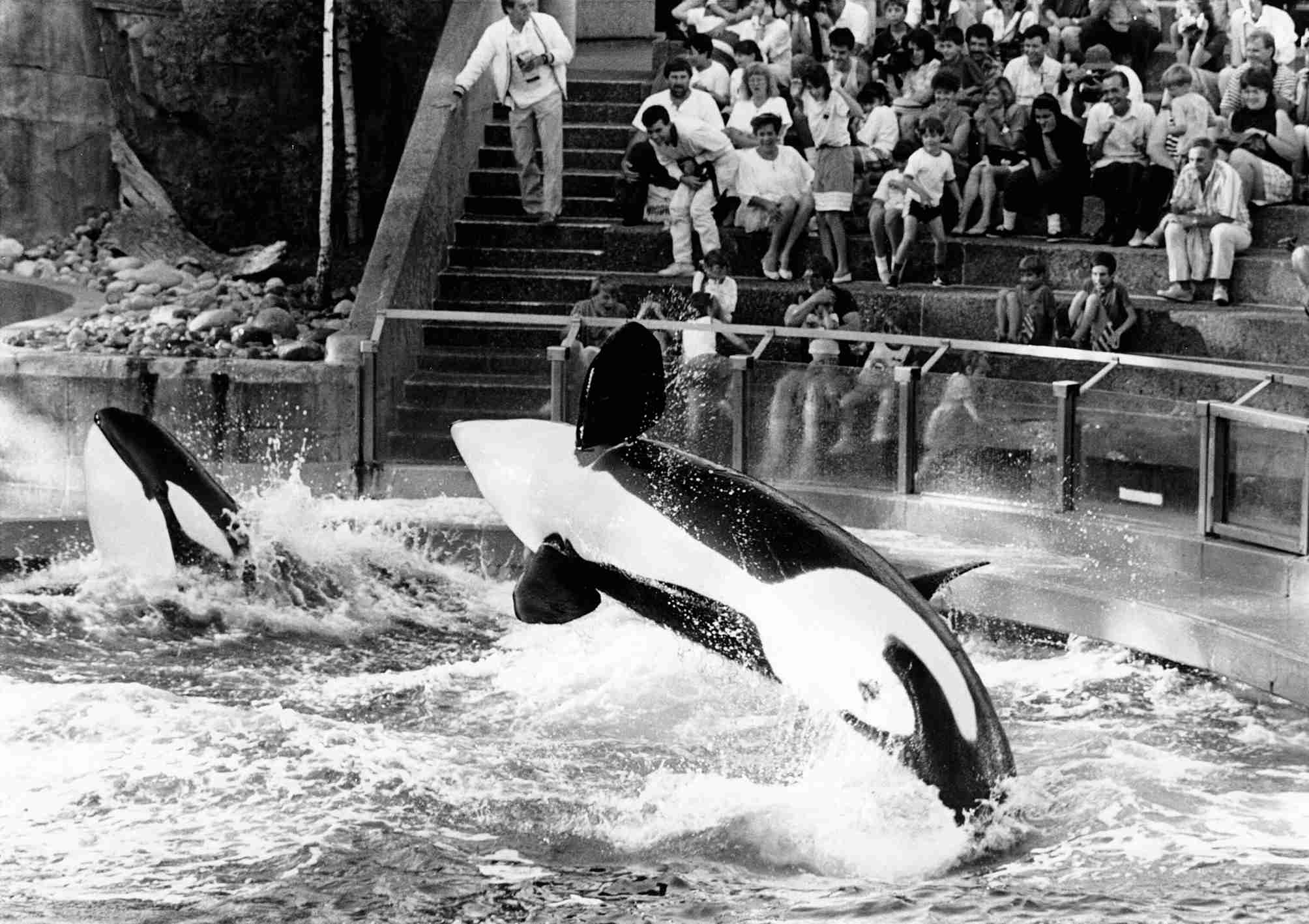 1970 – Mark Perry feeds herring to whales. Skana, on right, and smaller killer whale, 04, get vitamin-filled herring.