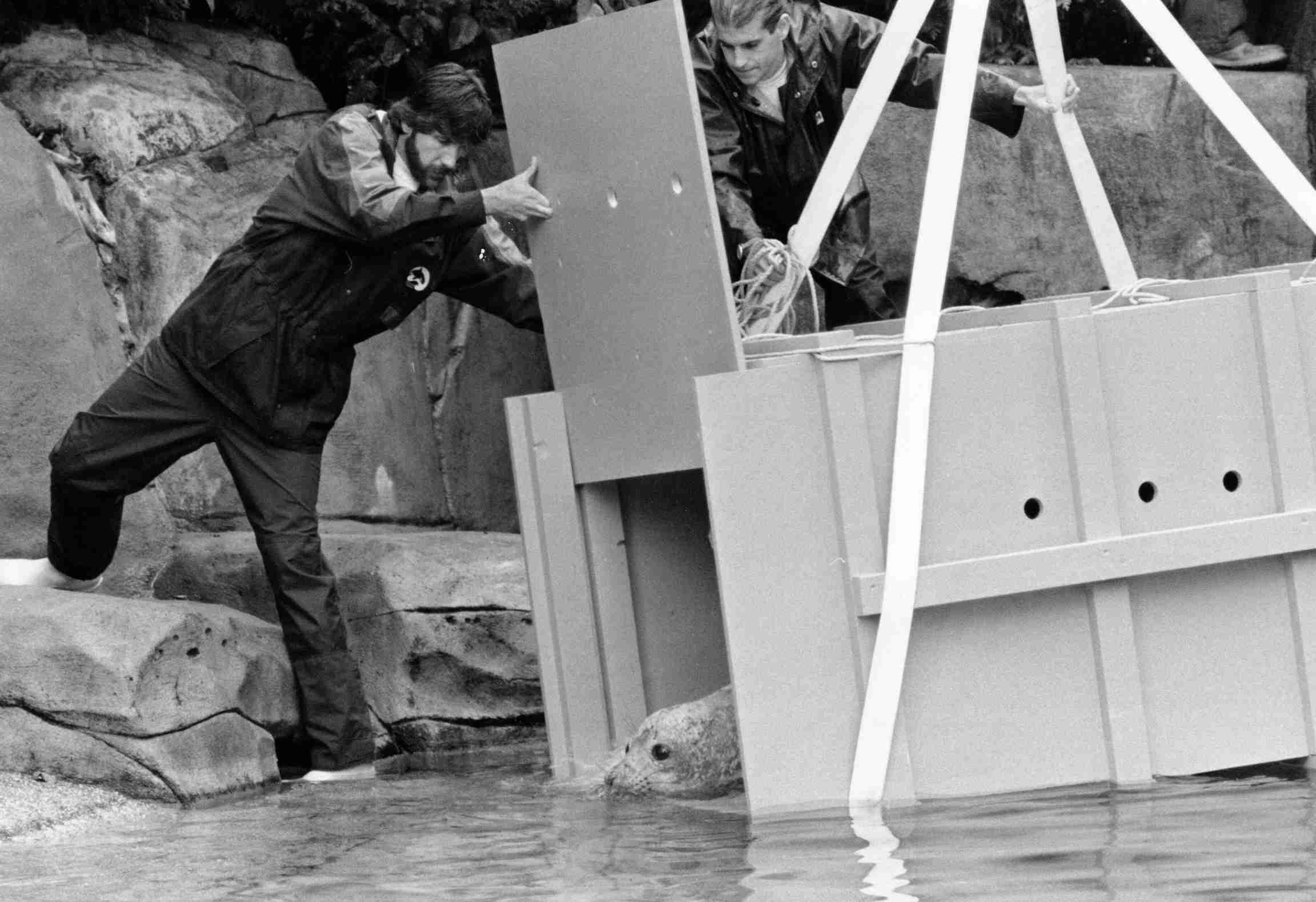 1970 – Whale of a moving job was undertaken Friday when staff of Stanley Park Aquarium transported two killer whales to new quarters in the B.C. Tel exhibit pool. Here a young male whale, who has been named ’04’ for time being, gets sling lift to new home. Aquarium’s pride, Skana, was also moved from to pool.