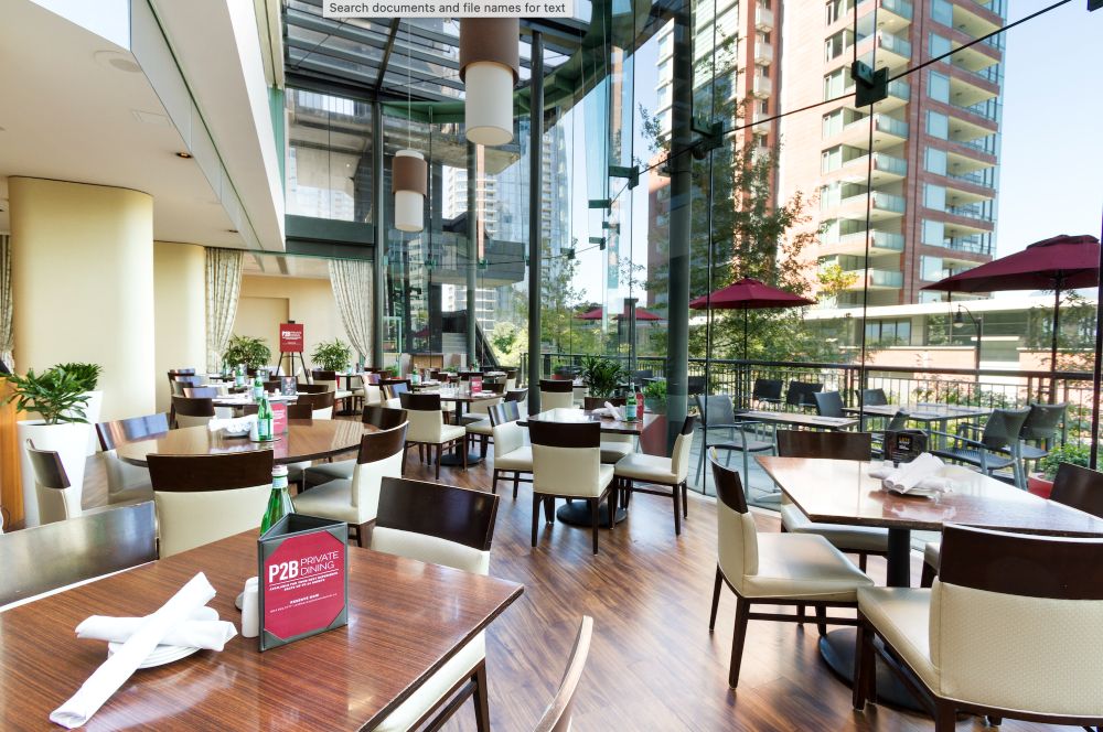 The spacious lobby of the Pinnacle Hotel Harbourfront leads up to the front desk, conference rooms, and elevators. At the back, it opens into the P2B Bistro space. This on-site restaurant offers some of the best views of the whole hotel, with two-story windows facing the North Shore. P2B also has a beautiful patio, which makes for the perfect spot to catch the sunset as it dips down behind Stanley Park.