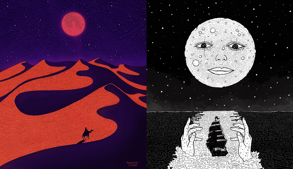 Ahmed Jozi is a visual/motion designer and a self-taught artist working across digital and traditional mediums. He was born in Iraq and grew up in Jordan, then immigrated with his family to Canada in 2008. Watching his father, Iraqi-Canadian artist Hashim Hannoon, paint inspired him to start drawing from a young age. His early work focused on designing original characters that were inspired by video games, anime, and films he loved. He always admired digital art, purchased an iPad, and taught himself how to draw on it. When he got good at it, he decided to learn motion graphics and 2D animations during his free time because it was relevant to his professional work and personal interests. Over time, his art matured, blending surreal environments and visual storytelling.