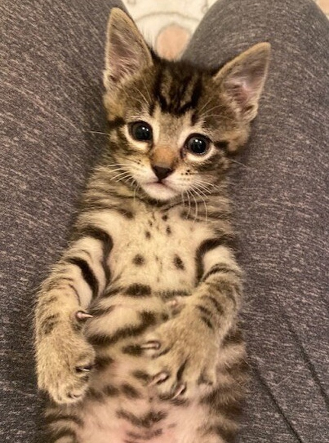 Because Pumba didn’t grow up with his mom or siblings, he’s still learning to play gently. He’ll need a little guidance to understand that hands aren’t toys. But don’t worry- he’s super smart and loves to play with wand toys, kickeroo toys, and big, soft toys. He loves a good scratch post too 🙂
