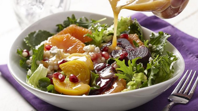 - To assemble the salad, spread salad greens on a platter or in a large bowl. Toss the couscous with 2 tablespoons of Orange Vinaigrette; sprinkle couscous over the salad greens. Halve beets and cut into 3 to 4 pieces; add to salad. Top with oranges, pomegranate arils and feta cheese. Drizzle with remaining Orange Vinaigrette and serve immediately.