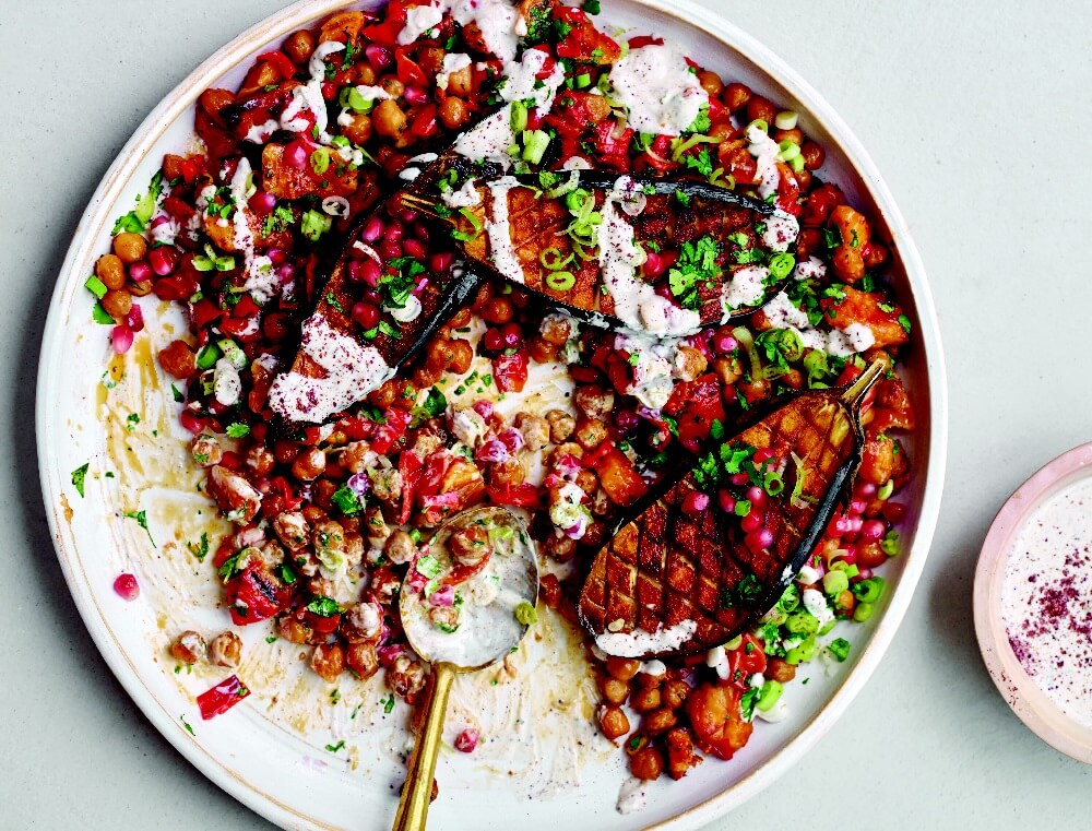 - Transfer the chickpeas, halloumi, and vegetables to a serving dish and stir in three-quarters of the cilantro. Place the eggplant halves on top and scatter with the remaining cilantro, green onions, pomegranate seeds, lime juice, and the sauce.